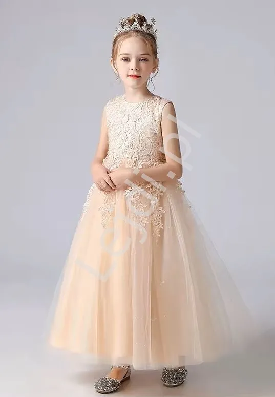 Długa elegancka suknia wieczorowa dla dziewczynki w kolorze brzoskwiniowo różowym. Długie suknie na wesele, bale, komunie dla dziewczynek.