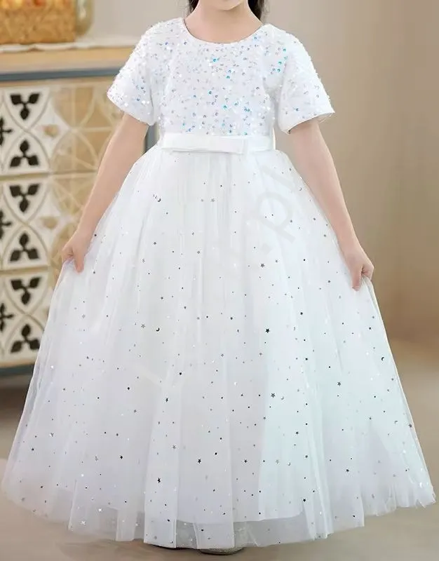 Długa biała sukienka wieczorowa dla dziewczynki z cekinami i gwiazdkami 6632