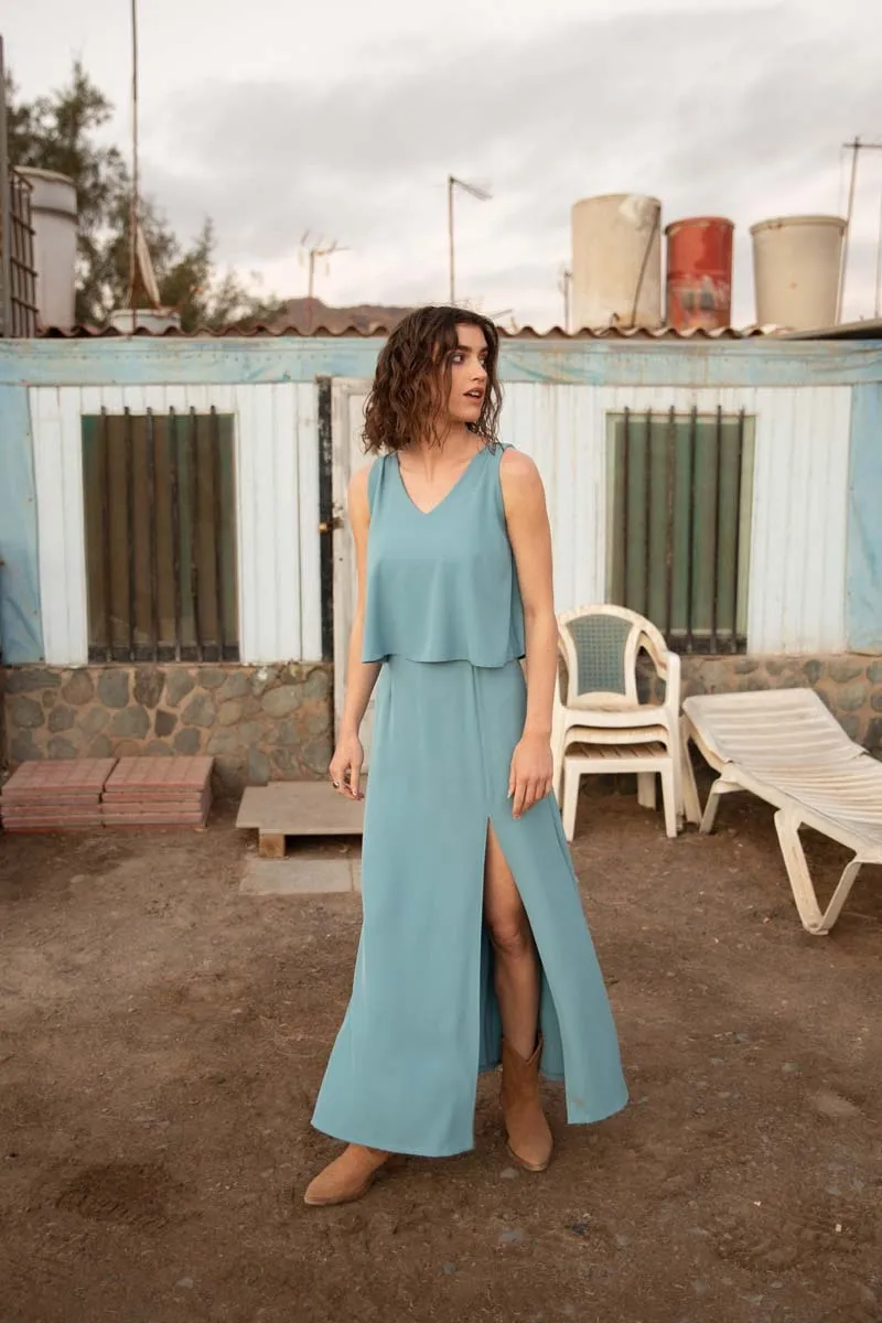 Niebieska Długa Sukienka z Dwuwarstwową Górą