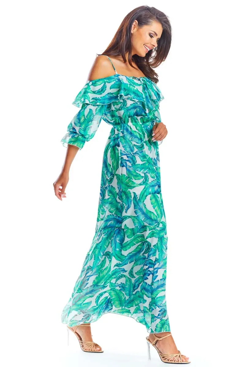 Długa wzorowana sukienka na ramiączkach - zielona - Rozmiar: 42