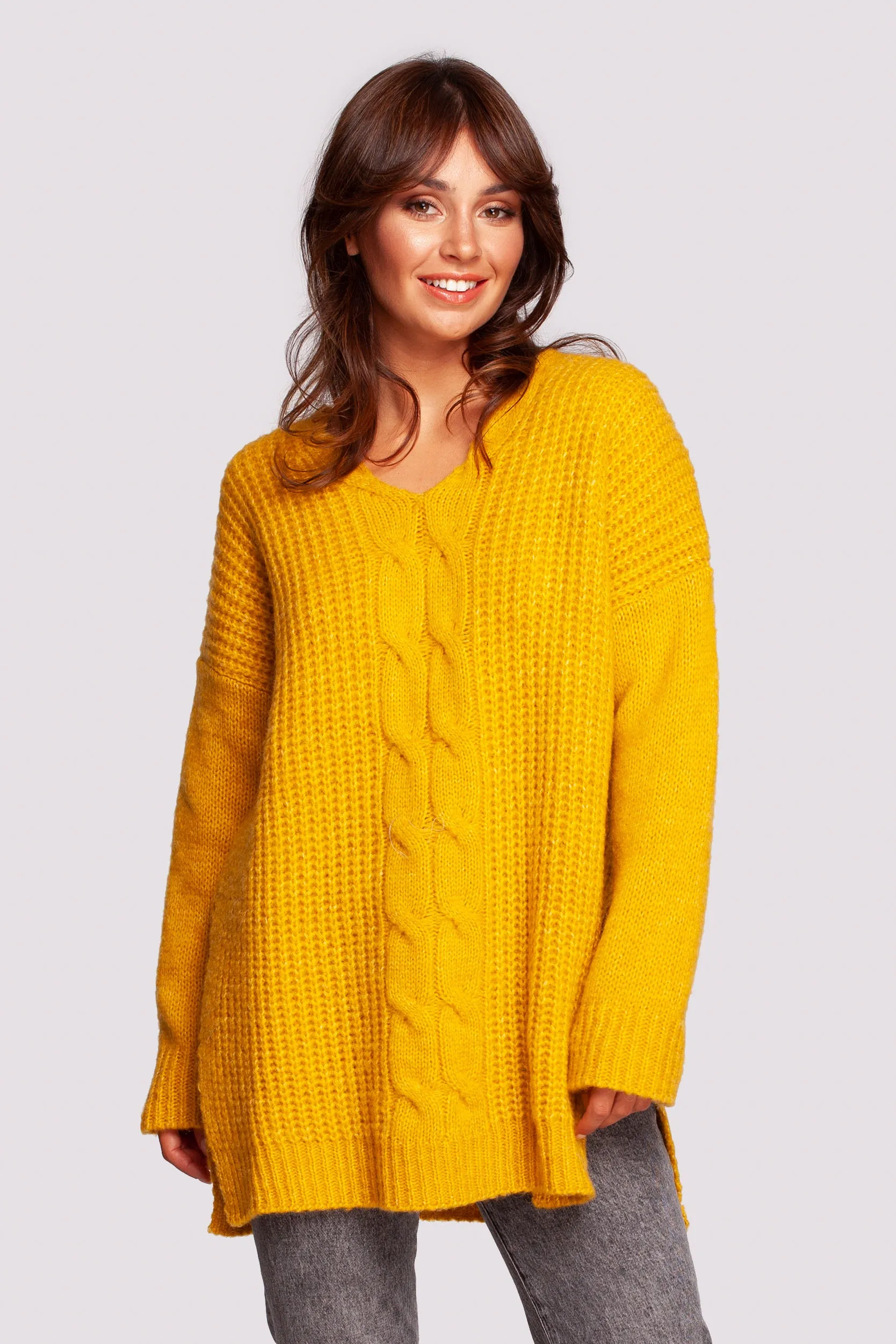 Długi Sweter z Rozcięciami po Bokach - Miodowy
