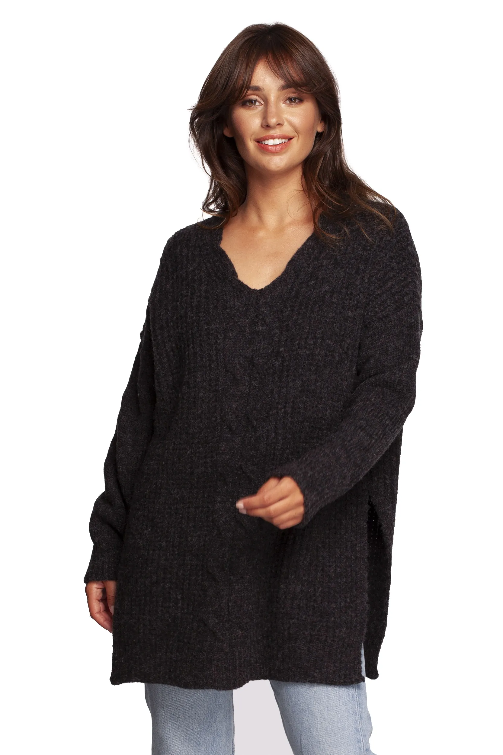 Długi Sweter z Rozcięciami po Bokach - Antracytowy