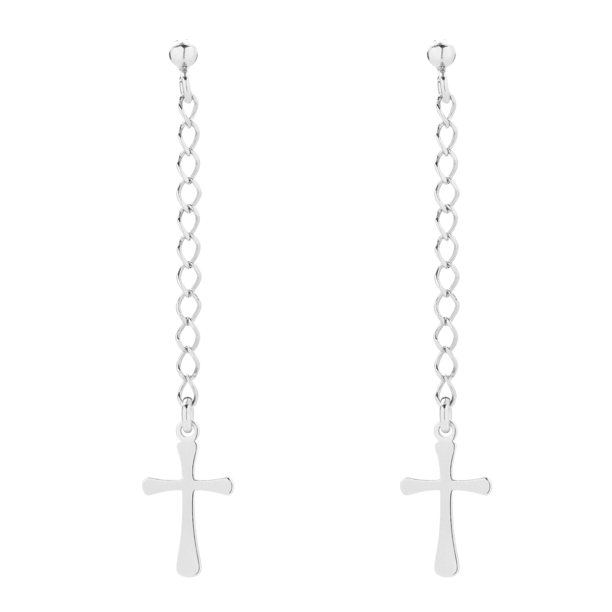 Złote kolczyki zdobione łańcuszkiem i krzyżykiem. Całość wykonana ze srebra 925 powlekanego 24 karatowym żółtym złotem. Zapinane na sztyft. Długość kolczyków ok 5 cm Grubość łańcuszka 2 mm. Łańcuszek 30 mm. Krzyżyk 18 x 10 mm Produkt o wadze poniżej 5 g. Zapakowane w eleganckie pudełeczko z logo marki. Posiadają logowaną metkę. Istnieje możliwość zamówienia kolczyków z innym modelem zawieszki, z kilkoma zawieszkami, na innym modelu sztyftu, na biglach, klipsów, w wersji ze srebra 925 lub srebra 925 powlekanego 24 karatowym różowym złotem, z dodatkowymi kamieniami, perłami lub kryształami SWAROVSKI® CRYSTAL itp.