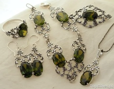 Wytworny, srebrny, oksydowany komplet biżuterii w składzie kolczyki, pierścionek i wisiorek. Biżuteria inspirowana wiktorianskimi motywami zdobniczymi to klasyka w złotnictwie. Kamień to w tym modelu malachit (synt) otoczony przez drobne (średnica ok 1,2mm) kryształki Swarovskiego w liczbie 19 sztuk. Misterne zdobienia, wykonane z dbałością o najmniejszy szczegół. Całość robi piorunujące wrażenie. Biżuteria wykonana została z dbałością o każdy szczegół, sprawi, iż każda kobieta poczuje się piękniejsza. Zapięcie kolczyków: angielskie Wymiary motywu zdobniczego to 16x19mm Wymiar kamienia w każdym elemencie zestawu to 14 x 10mm Srebro próby 925. W naszej ofercie znajdziecie Państwo bransoletkę, wisiorek i pierścionek i kolczyki do kupienia osobno. Kupując w zestawie oszczędzasz!