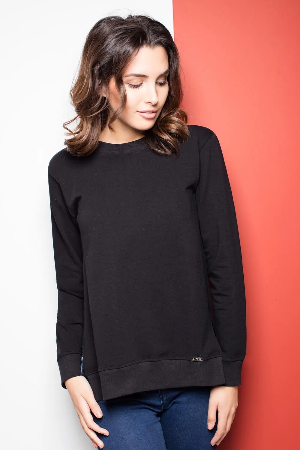 Dresowa Czarna Bluzka z Rozcięciem na Boku