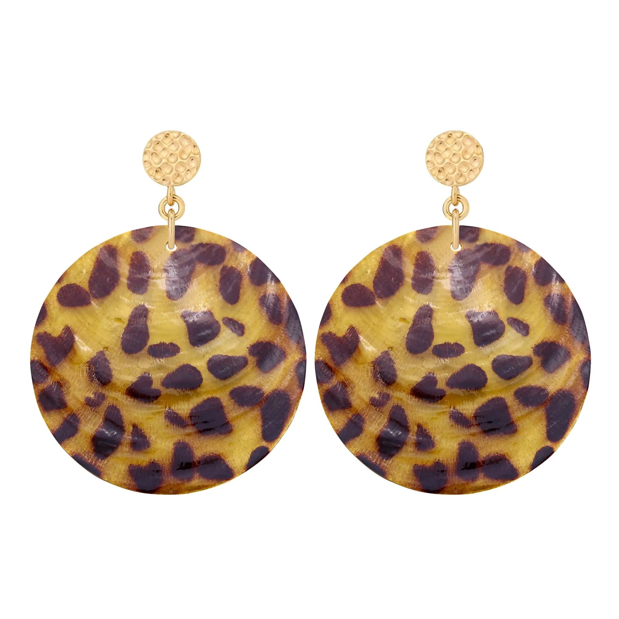 Duże kolczyki z brązowej masy perłowej. Całość wykonana ze srebra 925 powlekanego 24 karatowym żółtym złotem. Długość kolczyków 5,8 cm Masa perłowa 4,5 cm Produkt o wadze poniżej 5 g. Zapakowane w eleganckie pudełeczko z logo marki. Posiadają logowaną metkę. Istnieje możliwość zamówienia kolczyków z innym kolorem masy perłowej, z dodatkową zawieszką, w oprawie ze srebra 925 lub srebra 925 powlekanego 24 karatowym różowym złotem itp.