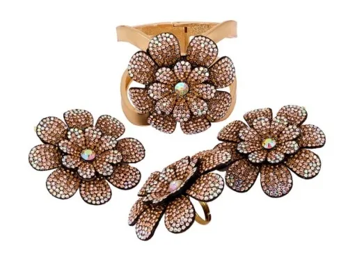 Efektowny, elegancki komplet składający się trzech elementów: Bransoletka średnica 6,7 cm , ozdoba 6.2 na 6.2 cm. Klipsy 6.2 na 6.2 cm. Pierścionek rozmiar uniwersalny, ozdoba wymiary 4 na 4 cm. Warstwa złota naniesiona w metodzie – PVD- napylanie próżniowe jonami tytanu, czy też azotkiem tytanu jest nowoczesną metodą nanoszenia powłok o bardzo dużej trwałości. * Pokryte jest w całości 4 – 8 mikronową warstwą 14K, 18K i 24K złota. * Warstwa złocenia pokryta jest lakierem jubilerskim, który zabezpiecza powłokę złota przed ścieraniem i nadaje wspaniały połysk * Biżuteria wykonana ze stali szlachetnej-należy do grupy stali o strukturze austenitycznej ( podobna chirurgiczna 316 L) : – jest hipoalergiczna i nie uczula, ponieważ nie emituje związków niklu do organizmu – nie koroduje, nie odbarwia się i długo cieszy swoim blaskiem – ścieralność uzależniona od noszenia i od pH ciała – nie wymaga specjalnej konserwacji jak biżuteria ze srebra, czy złota Ze względu na różne ustawienia monitorów oraz różną jakość wyświetlaczy zastosowanych w urządzeniach mobilnych, kolory przedstawione na zdjęciach mogą nieznacznie różnić się od rzeczywistych.