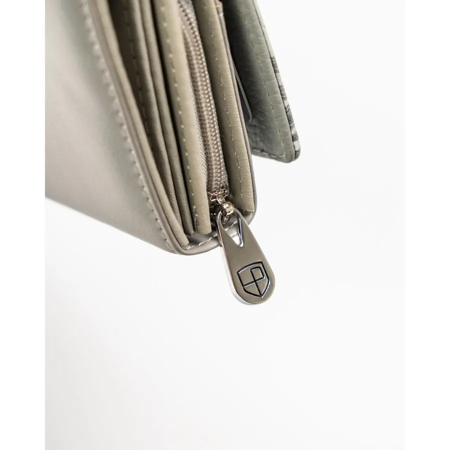 Wielokolorowy portfel ze skóry naturalnej i ekologicznej. Zamykany zatrzaskiem i wyposażony w system RFID. Model mieści dowód rejestracyjny. Kieszeń na monety zamykana suwakiem.