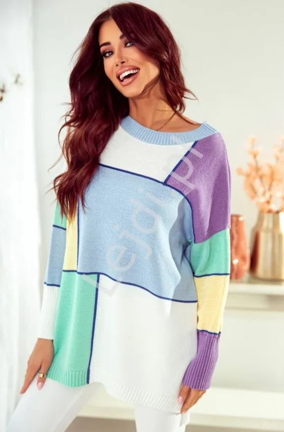 Kolorowy sweter damski oversize Hello Sun w odcieniach lawendy, błekitu i ecru