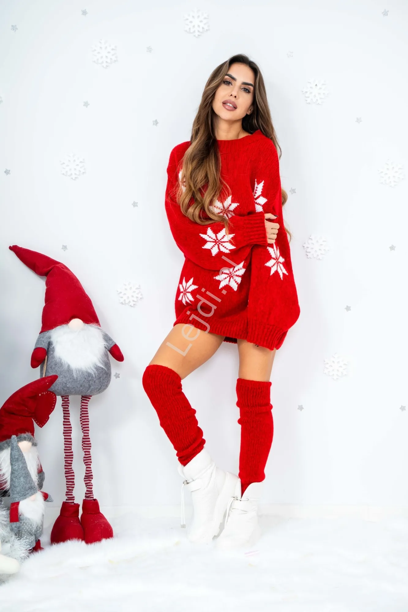 Dzianinowa czerwona sukienka Christmas Magic ze śnieżkami na zimę, Świeta, Mikołajki 6194