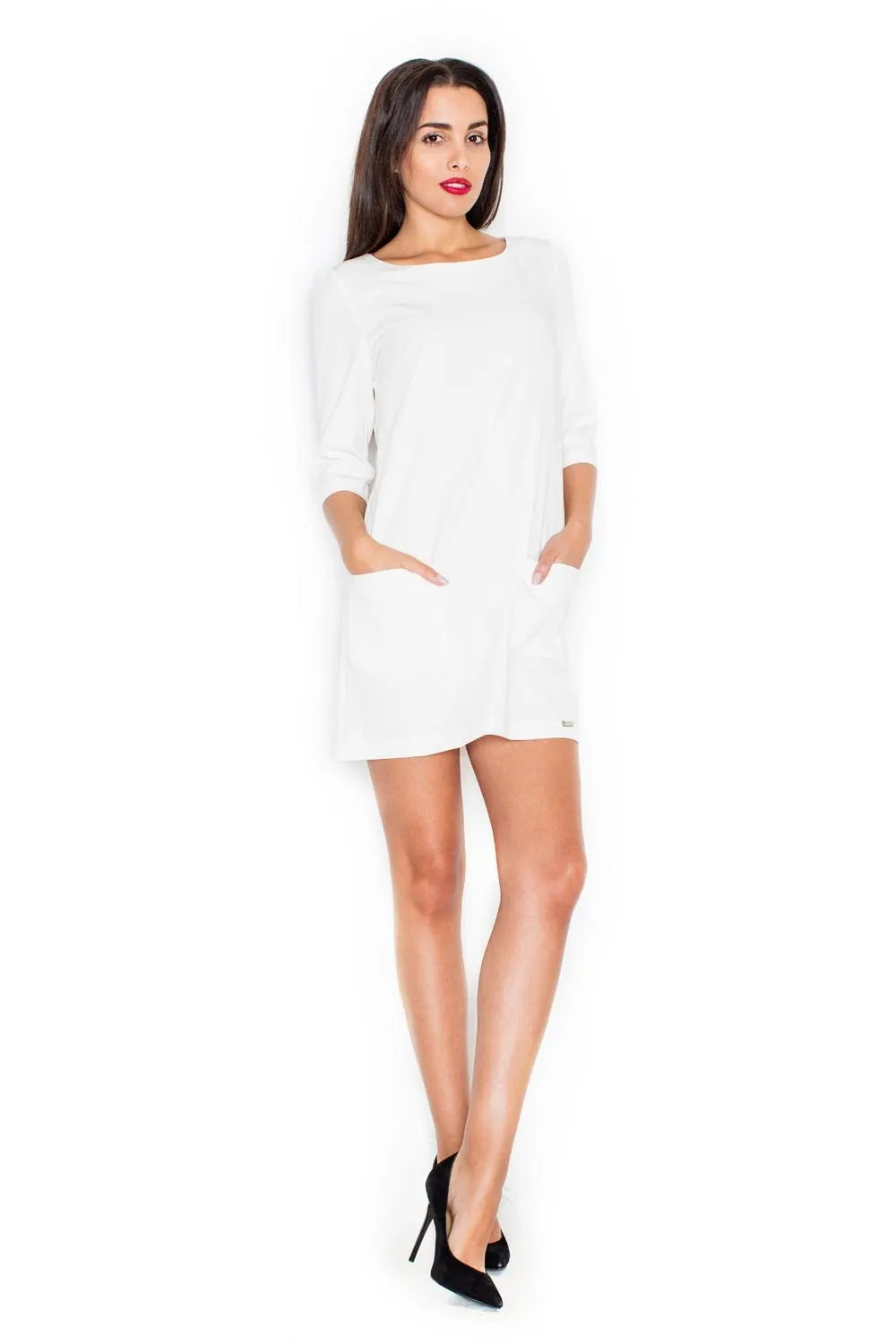 Ecru Kobieca Sukienka z Szerokim Dołem z Rękawem 3/4
