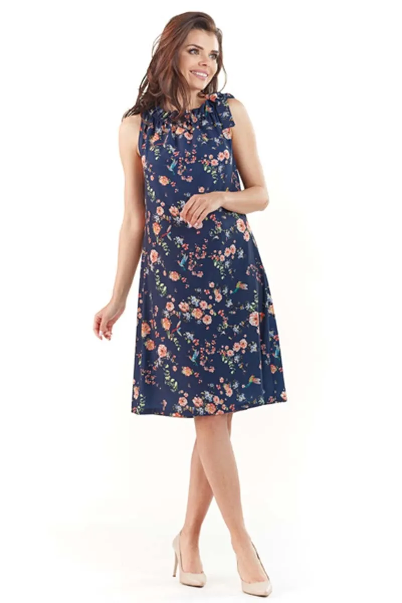 Ecru Kobieca Sukienka w Kwiatowy Wzór Kokardą na Ramieniu