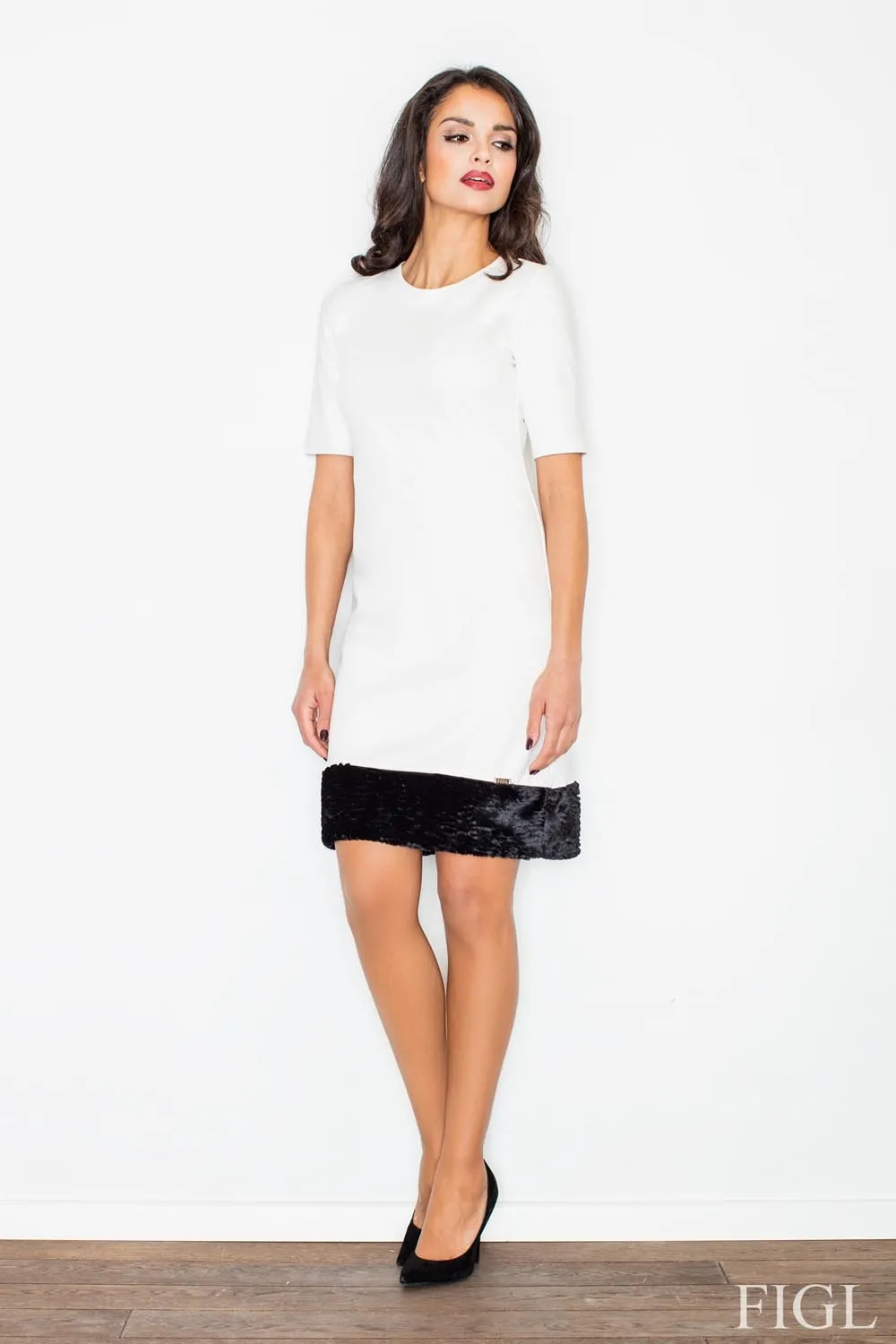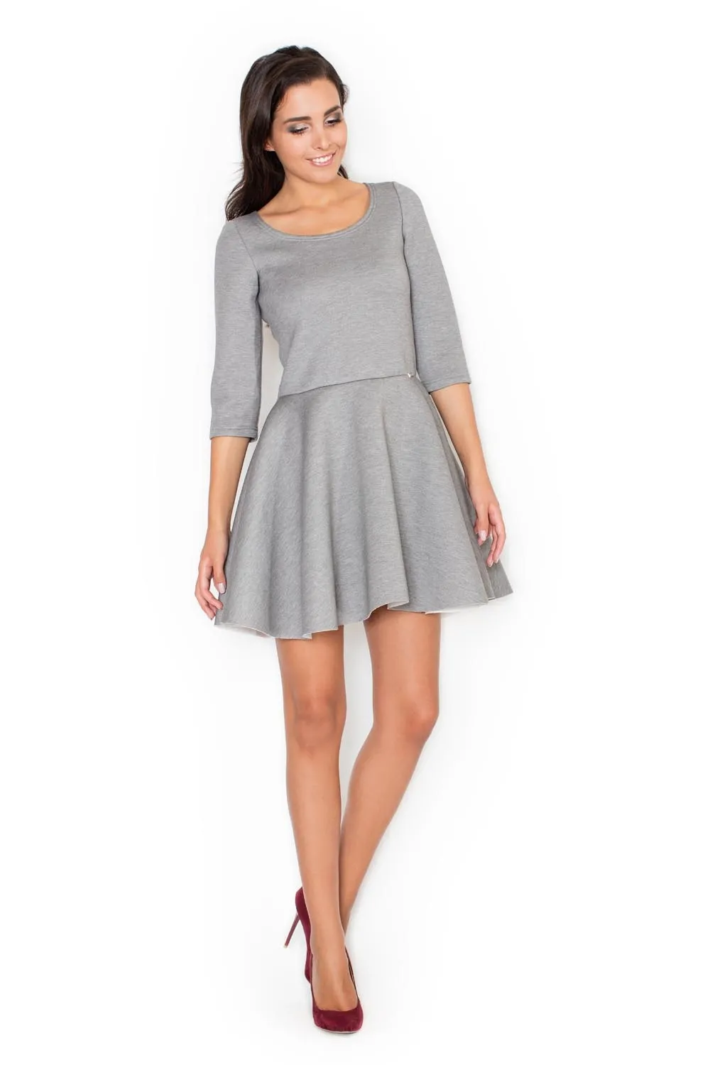 Ecru Kobieca Sukienka z Szerokim Dołem z Rękawem 3/4