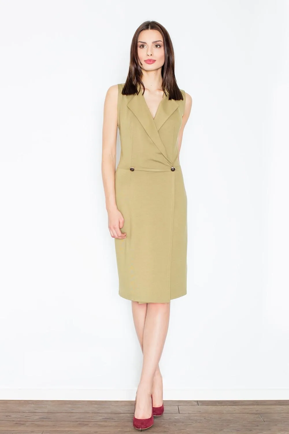 Oliwkowa Kopertowa Midi Sukienka bez Rękawów