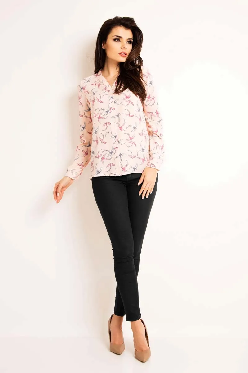 Różowa Koszulowa Bluzka z Dekoltem „V” w Jaskółki