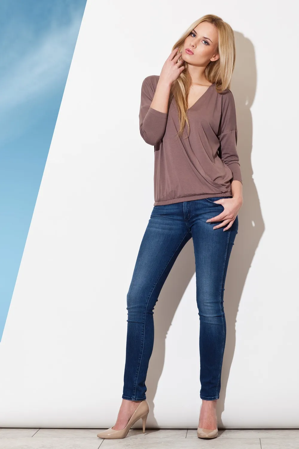 Brązowa Zbluzowana Bluzka z Długim Rękawem