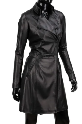 Dwurzędowy płaszcz skórzany damski wiązany paskiem DORJAN