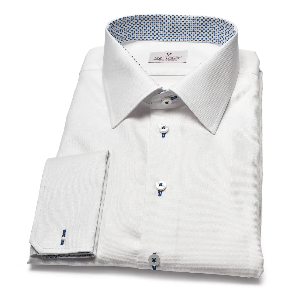 Elegancka biała koszula męska VAN THORN. Koszula jest uszyta z bawełny pochodzącej z austriackiej tkalni Getzner. Jest to tkanina typu twill czyli ma delikatny skośny splot. Wykończona metodą Top Care, dzięki czemu jest bardzo delikatna w dotyku, a przede wszystkim łatwa do prasowania i odporna na zagniecenia. Nawet po całym dniu noszenia wygląda świeżo i schludnie. Koszula ma klasyczny kołnierzyk i mankiety na spinki. Środek stójki jest kontrastowy, dziurki i guziki są przyszyte niebieskimi nićmi. Tkanina: Bawełna 100% W koszuli VAN THORN można modyfikować wymiary ponieważ koszule VAN THORN są szyte na zamówienie. Koszulę VAN THORN można zamówić z monogramem. Inicjały i kolor monogramu proszę podać w uwagach do zamówienia. Monogram haftujemy na lewym mankiecie. Jeśli chcieliby Państwo wprowadzić zmiany w koszuli, np. mankiety na spinki lub kieszonkę to jest to możliwe – prosimy o informację w uwagach do zamówienia.