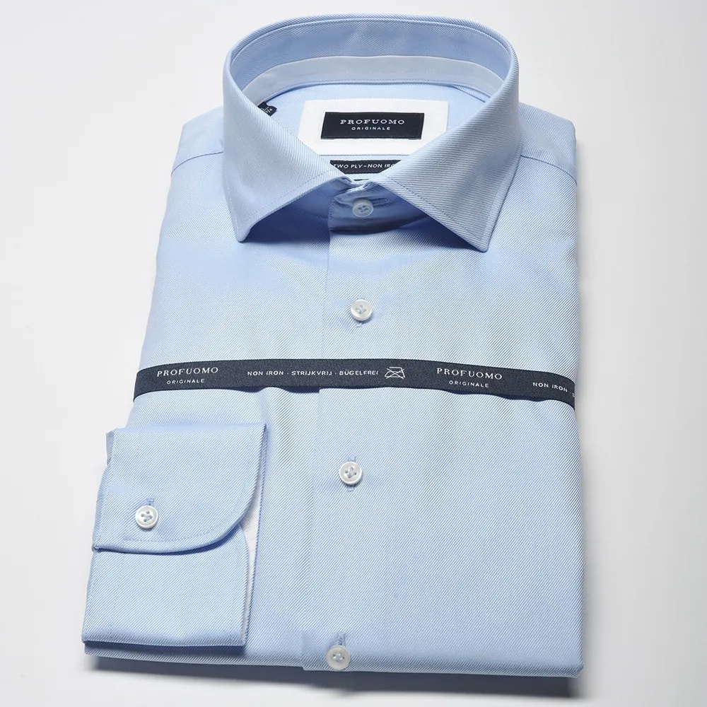 Błękitna koszula PROFUOMO z najwyższej jakości bawełny Postaw na wysoki komfort noszenia i przyjemność w dotyku, zamawiając w naszym sklepie internetowym błękitną koszulę taliowaną z kolekcji holenderskiej marki PROFUOMO. Model jest uszyty w 100% z bawełny TWO PLY – podwójnie skręcanej nitki, dzięki której jest trwalszy i miękki. Co więcej, wykorzystana tkanina jest mięsista oraz ma widoczną, bardzo delikatną strukturę skośną. Producent zadbał także o szybkość i łatwość prasowania, stosując wykończenie non iron – to właśnie dzięki niemu koszula nie jest tak mocno podatna na zagniecenia. Elegancka koszula z włoskim kołnierzykiem i nie tylko Oferowana koszula męska z włoskim kołnierzykiem ma również mankiety na guziki. Zarówno w nich, jak i w stójce wszyto elementy z białej tkaniny. Elegancki model typu Slim Fit idealnie wpisuje się w prawdziwie włoski styl, a jego jakość i staranność wykonania z pewnością spełnią oczekiwania nawet najbardziej wymagających klientów.