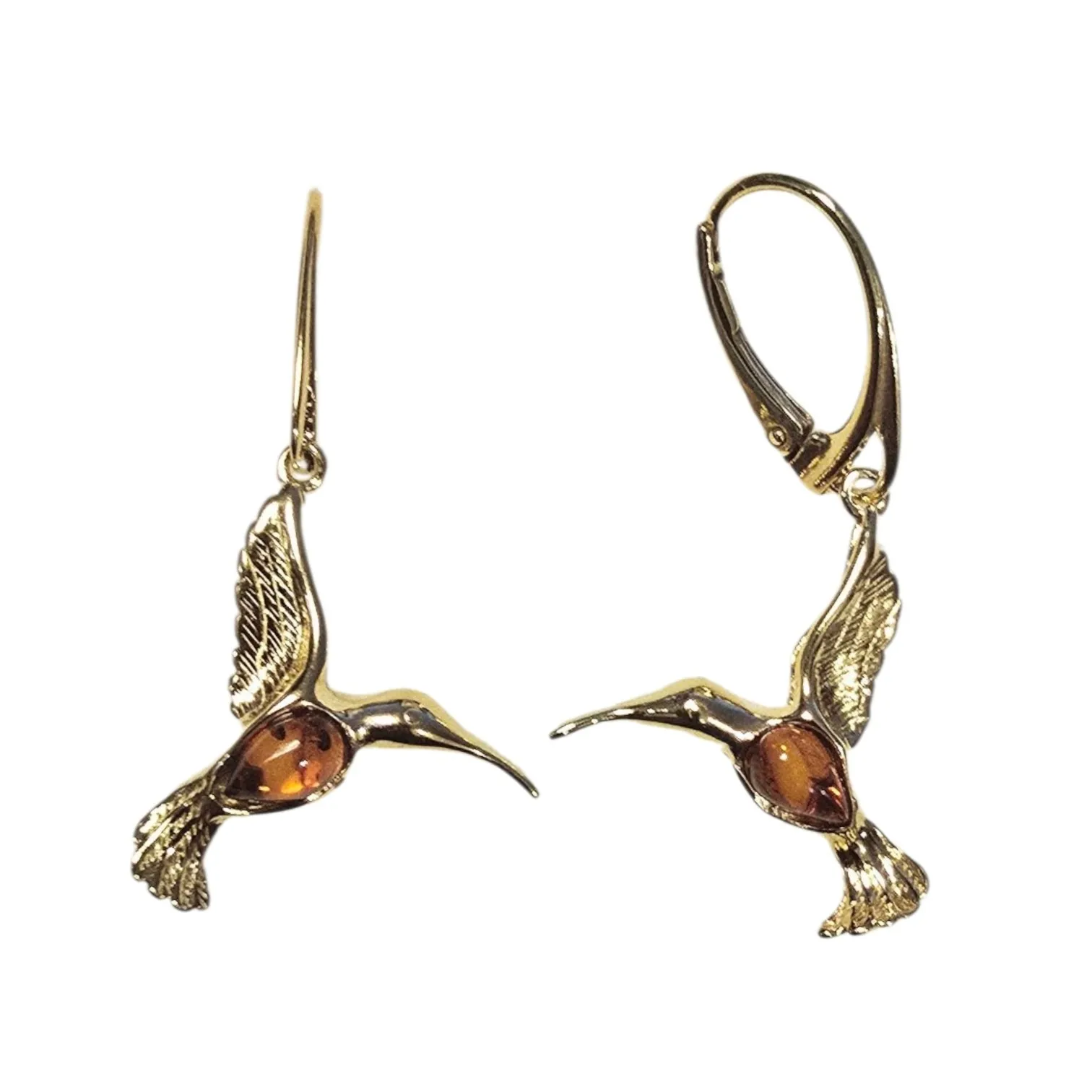 Kolczyki srebrne pozłacane koliberki z bursztynem
