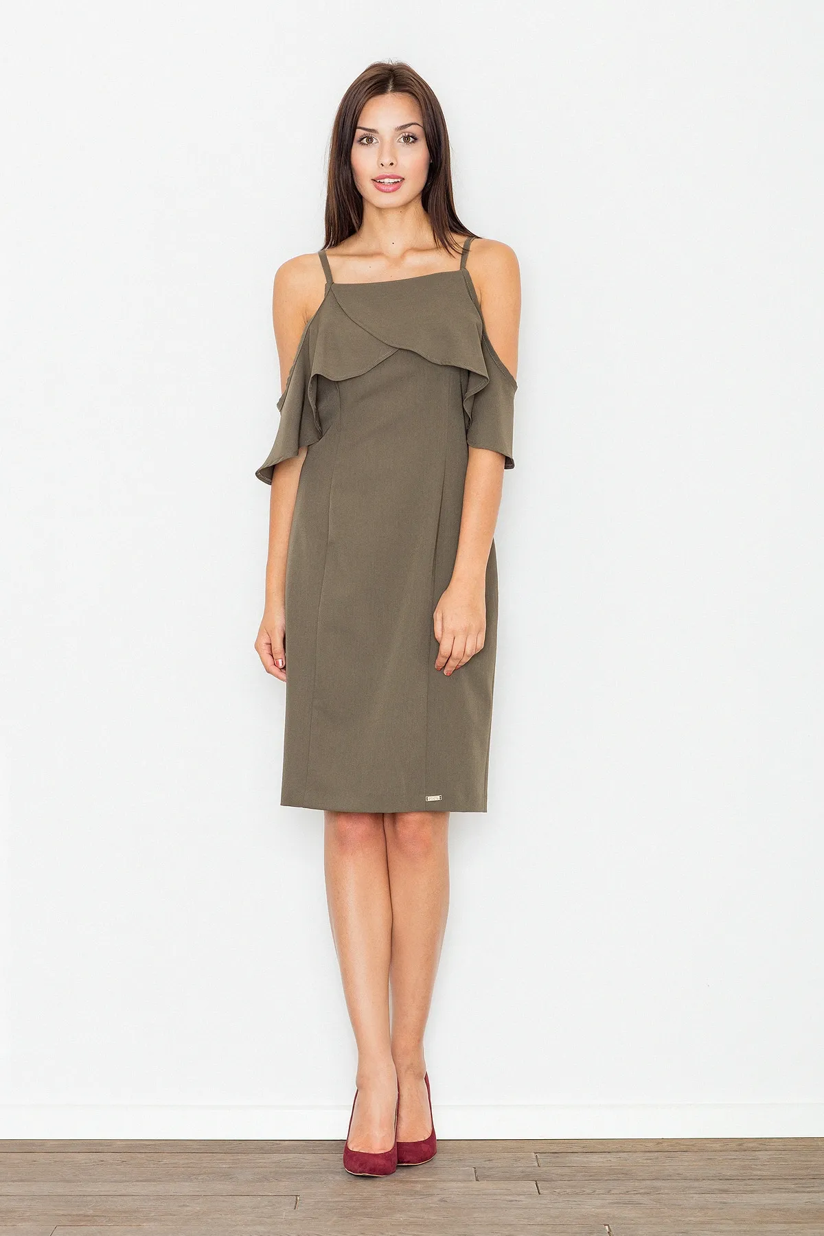 Elegancka Oliwkowa Sukienka Mini z Falbanką przy Dekolcie
