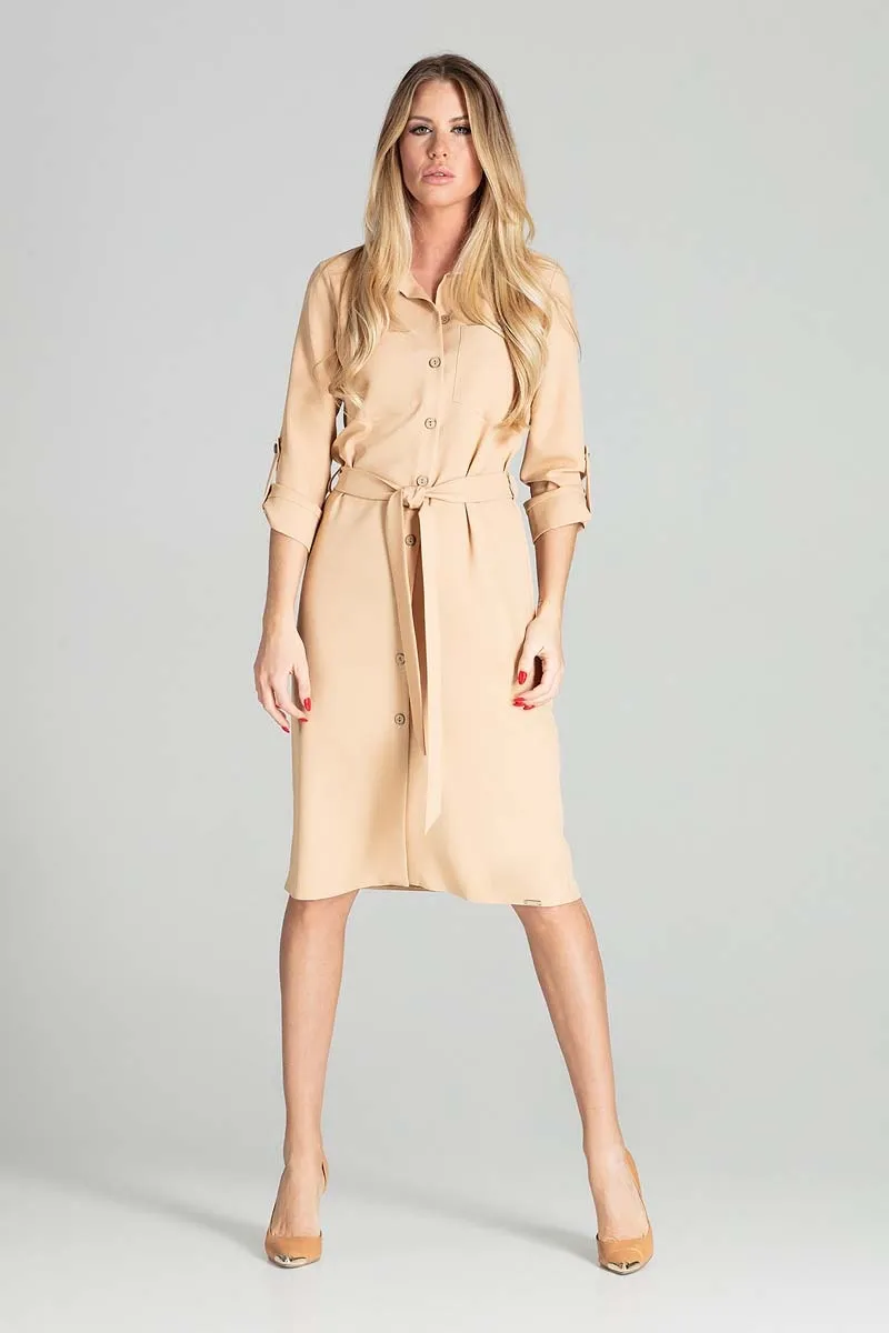 Sukienka Koszulowa z Podpinanym Rękawem - Beżowa