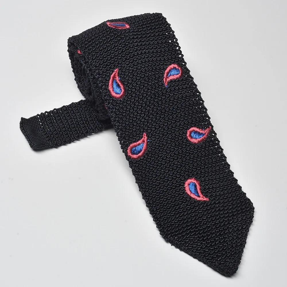Granatowy krawat z dzianiny (knit) w różowy wzór paisley