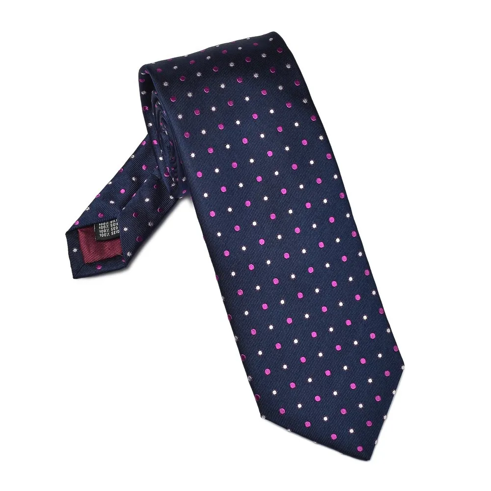 Elegancki, granatowy krawat VAN THORN. Krawat wykonany jest z doskonałej jakości jedwabiu produkowanego we Włoszech. Wzór krawata to białe i niebieskie kropki. Ten krawat będzie pasował do spotkań biznesowych jak i okazjonalnych. Krawat ma bordową podszewkę i dodatkowe wypełnienie w środku, dzięki czemu ładnie się układa i prosto się go wiąże.
