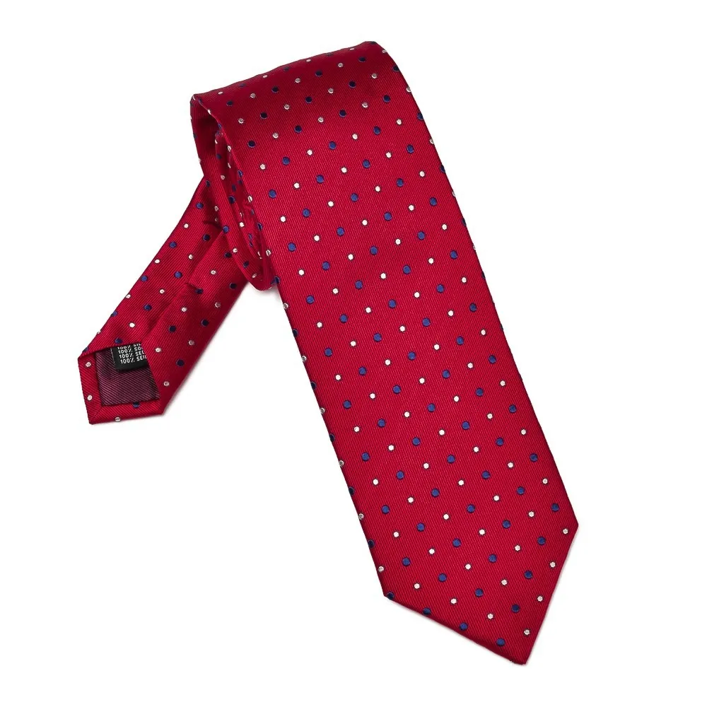 Elegancki, różowy krawat VAN THORN. Krawat wykonany jest z doskonałej jakości jedwabiu produkowanego we Włoszech. Wzór krawata to białe i niebieskie kropki. Ten krawat będzie pasował do biznesowych stylizacji. Krawat ma bordową podszewkę i dodatkowe wypełnienie w środku, dzięki czemu ładnie się układa i prosto się go wiąże.