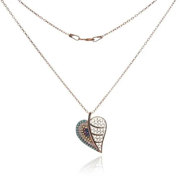 Srebrny naszyjnik pozłacany różowym złotem listek z turkusem i kolorowymi cyrkoniami