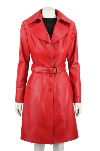 KRN412 - czerwony płaszcz skórzany damski jednorzędowy z paskiem DORJAN