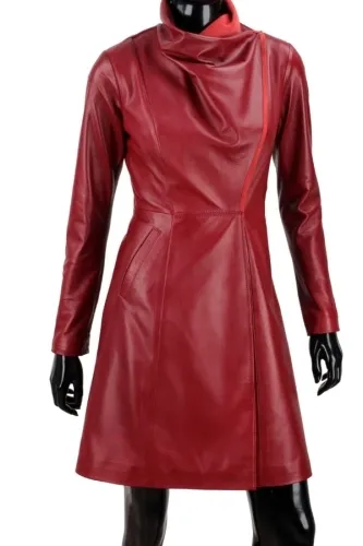 EST467 - czerwony płaszcz skórzany damski z kieszeniami DORJAN