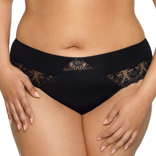 Figi z czarnej wzorzystej siateczki boki i tył z beżowego tiulu. Tył z podwójnej siateczki.Skład: 91% poliamid, 5% elastan, 4% elastan…