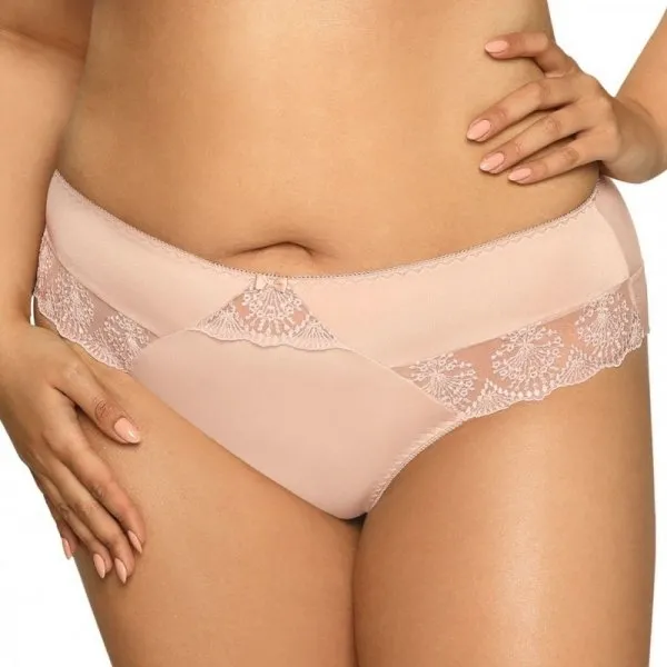 Figi z gładkiej mikrofibry i delikatnych wstawek tiulowej siateczki z efektownym haftem. Tył z podwójnej tiulowej siateczki.Skład: 91% poliamid, 5% bawełna, 4% elastan…