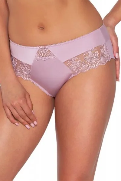 Figi typu brazyliany- z gładkiej mikrofibry i delikatnych wstawek tiulowej siateczki z efektownym haftem- tył wykończony podwójnym tiulem Skład: 91% poliamid, 5% bawełna, 4% elastan…