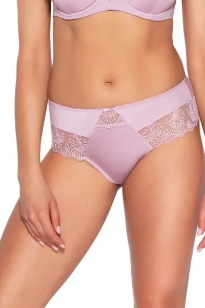Figi damskie- klasyczny krój- gładka mikrofibra- z przodu koronka o kwiatowym motywie, podszyta beżową tkaniną- w pasie płaska gumka z ozdobnym elementem biżuteryjnym- tył nogawek zakończony podwójnym tiulem Skład: 91% poliamid, 5% bawełna, 4% elastan…