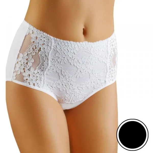Wysokie figi damskie, zabudowane na biodrach. Wykonane z gładkiej mikrofibry, delikatnej tiulowej siateczki i efektownej koronki o kwiatowym motywie.Skład: 85% poliester, 15% elastan….