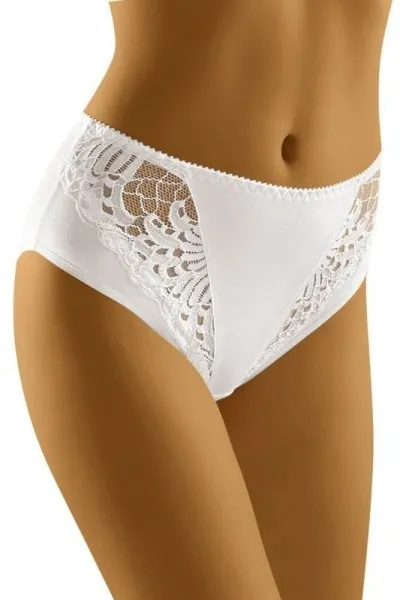 Figi damskie z wysoką linią talii, zabudowane na biodrach. Boki ozdobione efektowną ażurową koronką. Skład: 95% bawełna, 5% elastan…