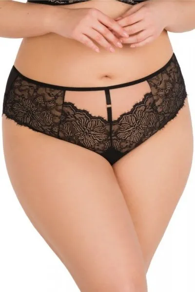 Figi damskie typu brazyliany- z siateczki i efektownej koronki- z przodu ozdobny paseczek- tył z koronki- linia talii wykończone elastyczną lamówkąSkład: 90% poliamid, 7% elastan, 3% poliester…