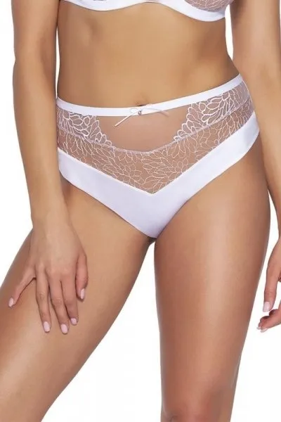 Piękne, koronkowe figi typu tanga. Całość z białej, kwiecistej koronki. Z przodu i z tyłu efektowne wycięcie.Materiał: 75% poliamid, 20% elastan, 5% bawełna…