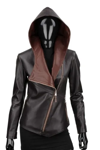 FRI124A_B - brązowa kurtka skórzana damska z dużym kapturem DORJAN
