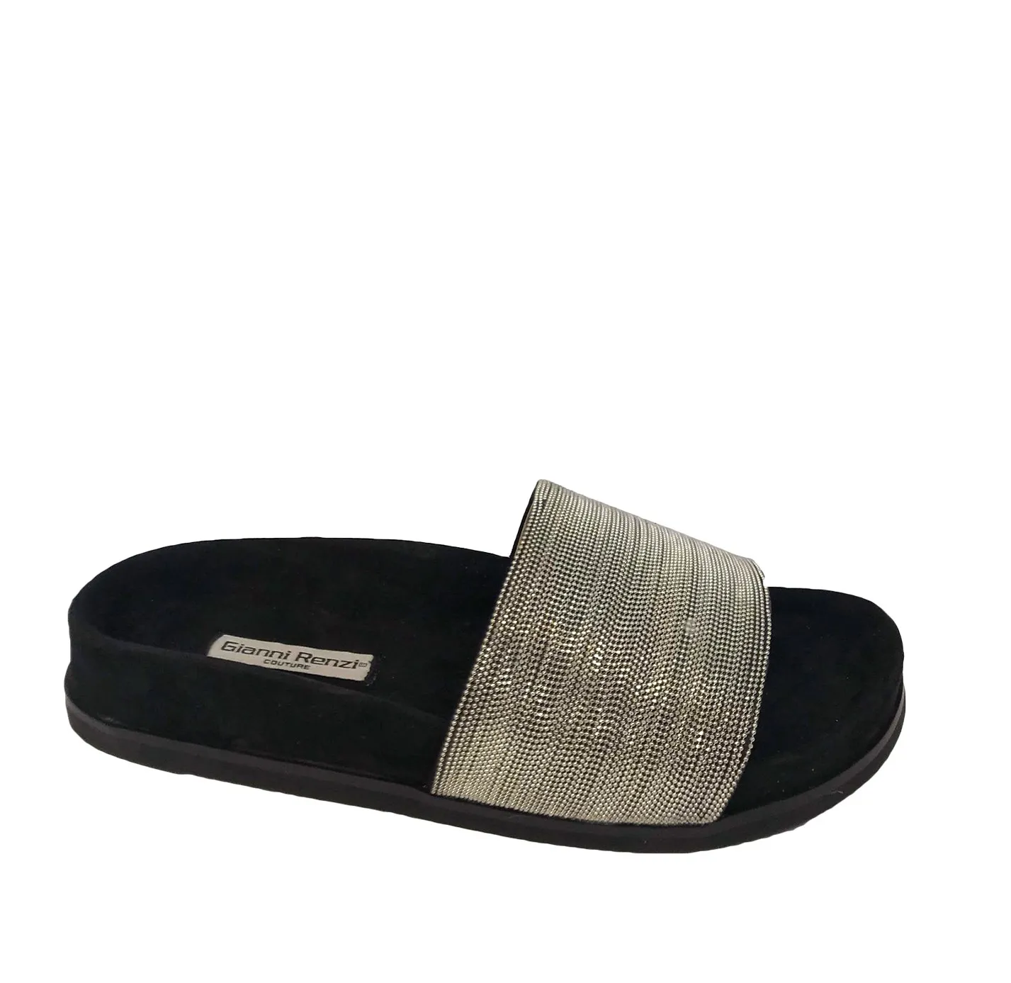 Bestsellerowy model klapek Gianni Renzi. Wykonane z pikowanej skóry, która dodatkowo ozdobiona została metalowymi ćwiekami w kolorze złota. Gumowa, stabilna podeszwa zapewnia komfort podczas chodzenia. Absolutny MUST HAVE zarówno plażowych jak i miejskich stylizacji. Materiał: 100% skóra cielęca Materiał: 100% PVC