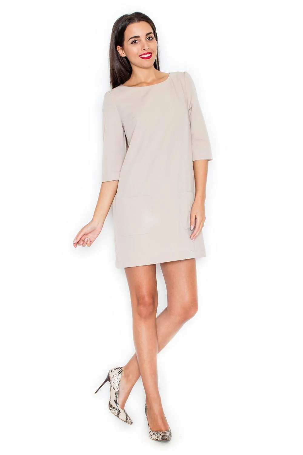 Beżowa Trapezowa Sukienka z Nakładanymi Kieszeniami
