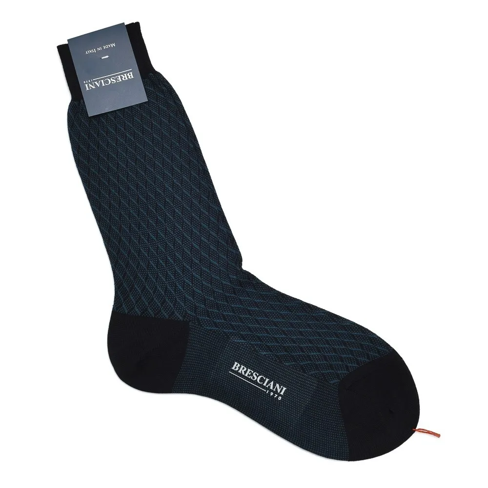 Męskie skarpety włoskiej marki Bresciani w kolorze granatowym z niebieskimi rombami. Skarpetki Bresciani są wykonane z najlepszej dostępnej egipskiej bawełny Mako. Część palcowa ze stopą są ręcznie łączone aby idealnie pasowały do stopy i wyjątkowo komfortowo się nosiły. Skarpetki mają granatowy kolor, nadają się idealnie do oficjalnych stylizacji. Skład: bawełna mako 100% Made in Italy