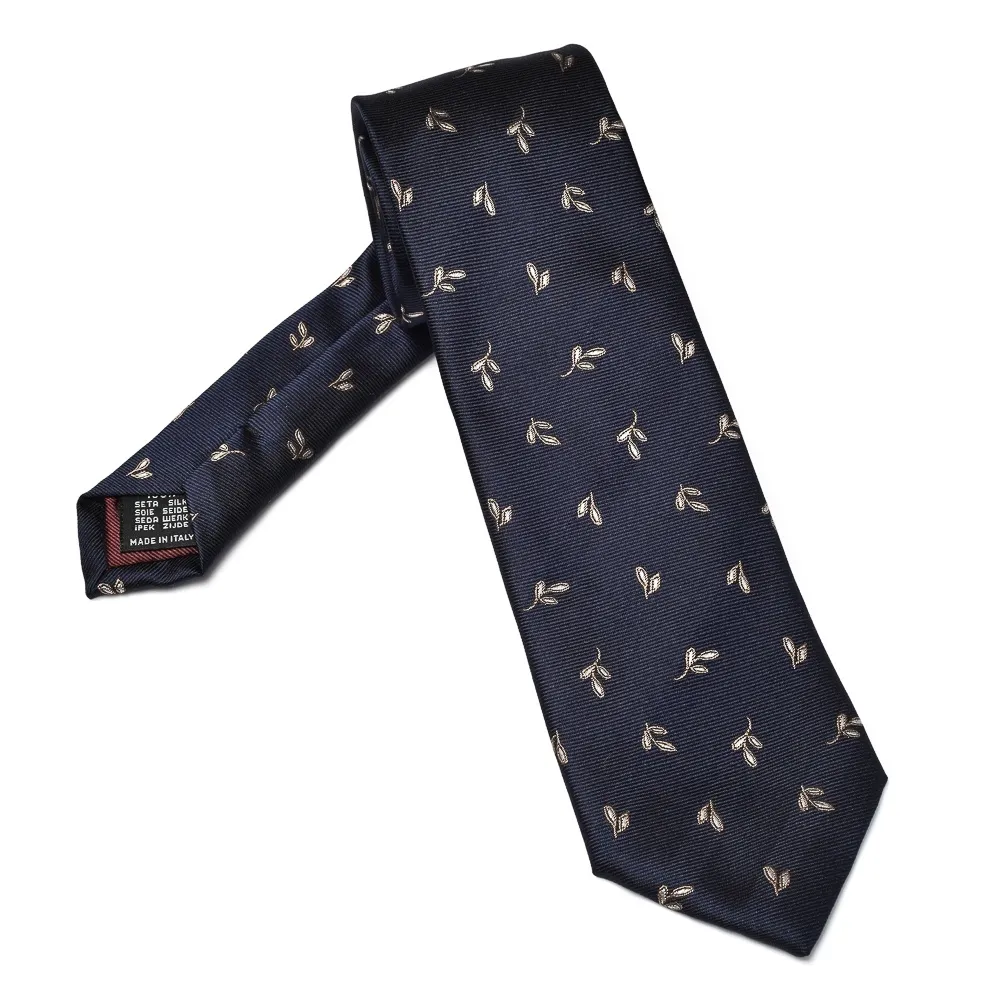 Elegancki granatowy krawat marki VAN THORN. Wykonany z jedwabiu, na bordowej podszewce. Krawat ma delikatny wzór czerwonych listków z białym wypełnieniem w środku. Jest elegancki i stonowany, będzie pasował do biznesowych stylizacji. Idealny do granatowego czy szarego garnituru. Może być doskonałym prezentem dla eleganckiego mężczyzny.