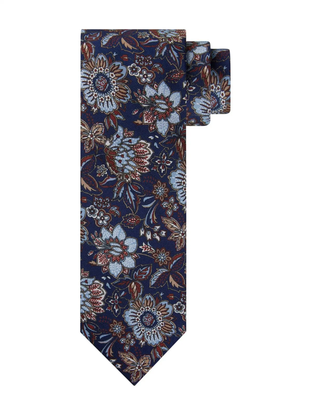 Granatowy jedwabny krawat w czerwony wzór paisley Ten krawat jest charakterny i będzie świetnie zgrywał się z białą i błękitną koszulą zarówno gładką jak i w drobną kratkę lub prążek. Tego krawata lepiej nie łączyć z koszulami z różnymi nadrukami o podobnej wielkości. Będzie wtedy za dużo się działo. Krawat ma klasyczną kolorystykę: granatowe tło doskonale łączy się z czerwonym niewielkim wzorem paisley a niektóre wzorki mają dodatkowo kolor srebrny. Miłośnik wzoru paisley znajdzie tutaj zarówno klasykę jak i wyrazistość. Szerokość krawata 7,5 cm Długość 146 cm