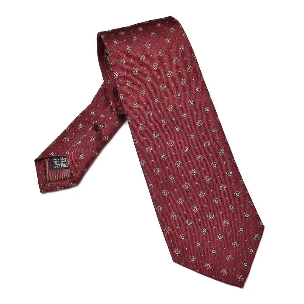 Elegancki granatowy krawat marki VAN THORN. Wykonany z jedwabiu, na bordowej podszewce. Krawat ma wzór bardzo drobnych białych kropek oraz średniej wielkości bordowych kwiatków z białym środkiem. Jest elegancki i stonowany, będzie pasował do biznesowych stylizacji. Idealny do granatowego, grafitowego czy szarego garnituru. Może być doskonałym prezentem dla eleganckiego mężczyzny.