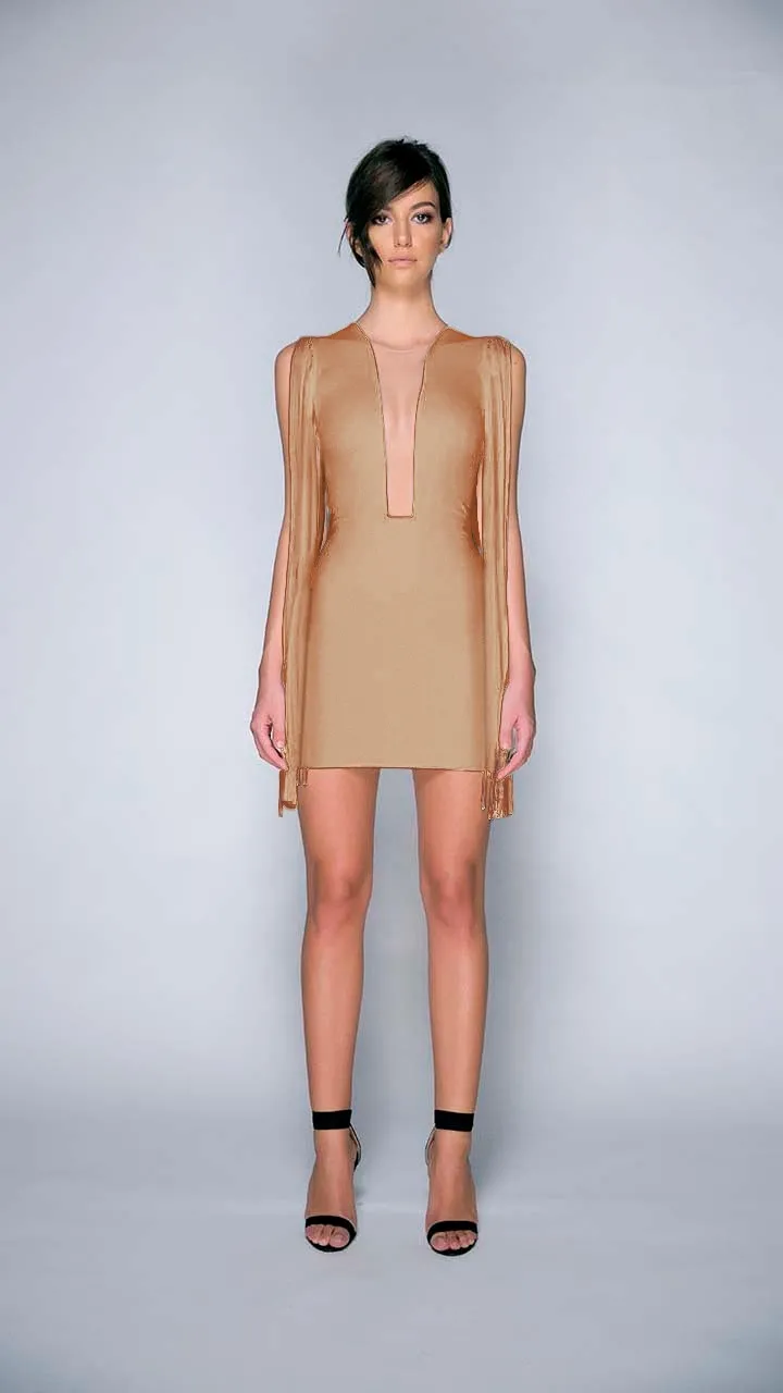 Zjawiskowa mini sukienka marki Hamel. Nietuzinkowy design i nowoczesny krój zmysłowo podkreślają kobiecą sylwetkę uwydatniając biodra i wyszczuplając talię. Głęboki dekolt z przodu zabudowano transparentną siateczką zapewniając komfort podczas noszenia. Przy ramionach umieszczono długie, zwiewne frędzle nadając całości ekstrawaganckiego wyrazu. Zapinana z tylu na klasyczny zamek. Materiał: 91% poliester, 9% elastan