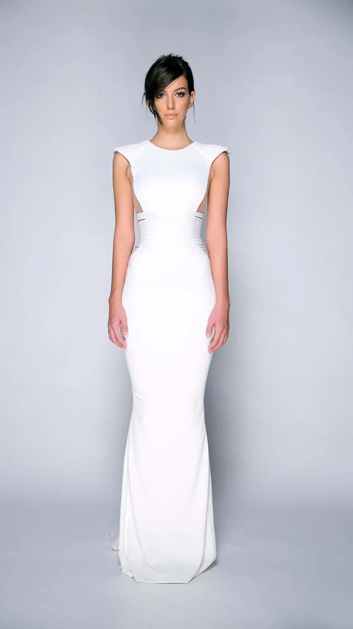 Zjawiskowa, wieczorowa suknia marki Hamel. Nietuzinkowy design i nowoczesny krój zmysłowo podkreślają kobiecą sylwetkę uwydatniając biodra i pośladki. W talii umieszczono fantazyjne paseczki, które dodają całości ekstrawaganckiego wyrazu. Asymetryczny tren sprawia, że kreacja nadaje się idealnie na wystawne przyjęcia typu red carpet. Zapinana z tyłu na klasyczny zamek. Materiał: 91% poliester, 9% elastan