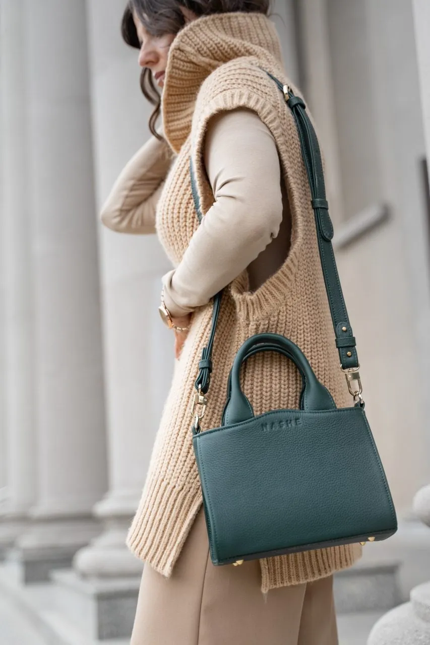 Torebka Nashe Harmony Bag jest: wielofunkcyjna: listonoszka, torebka na ramię, mini shopperka i torebka do ręki w jednym uszyta z naturalnej skóry groszkowej najwyższej jakości stworzona według autorskiego projektu wykonana w polskiej pracowni z miłością, pasją i w zgodnie ze sztuką kaletniczą wyposażona w regulowany, odpinany pasek o szerokości 2cm i długości 104-121 cm krótkie, odpinane rączki do noszenia w ręku, długość 38 cm wykończona metalowymi okuciami zabezpieczona chroniącymi przed zarysowaniami skóry od spodu nóżkami zapinana na taśmę suwakową z suwakami z logo NASHE wyłożona elegancką czerwoną podszewką z delikatnym satynowym połyskiem funkcjonalna: 2 kieszenie: płaska na dokumenty lub karty + kieszonka zamykana na suwak posiada kosmetyczkę dopinaną na troczku zapakowana w worek przeciwkurzowy na torebkę wymiary: wymiary: Szerokość na górze: 33 | Szerokość na dole: 23 Wysokość bez uszu: 17 | Wysokość z uszami: 24 Głębokość: 13 | mieści A5 waga: 0.6kg Co znajduje się w pudełku?